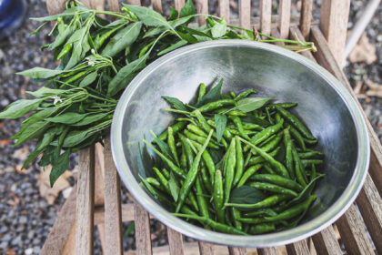 何度目かの収穫を迎え、畑の青唐辛子が青々とした実をたわわに揺らしている。唐辛子は夏から秋にかけて、収穫すればするほど次々と花を咲かせ、...