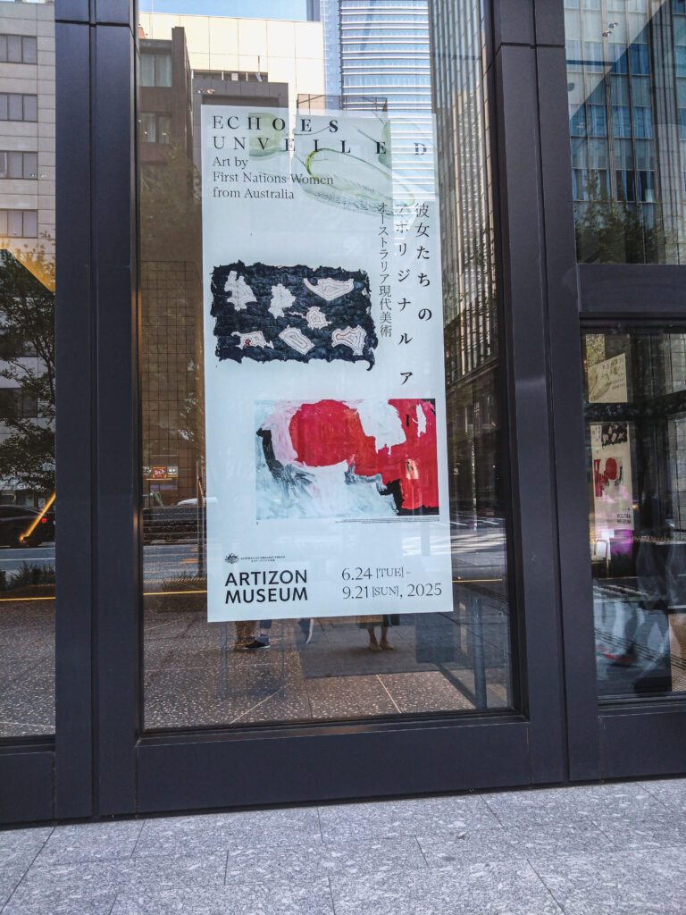 目的地であるアーティゾン美術館が見えてきました。ガラス張りのモダンな建物に、今日の展示を知らせるポスターが掲げられています。**「彼女たちのアボリジナルアート」**と書かれたポスターは、シンプルなのに、なんだか力強いオーラを放っていました。