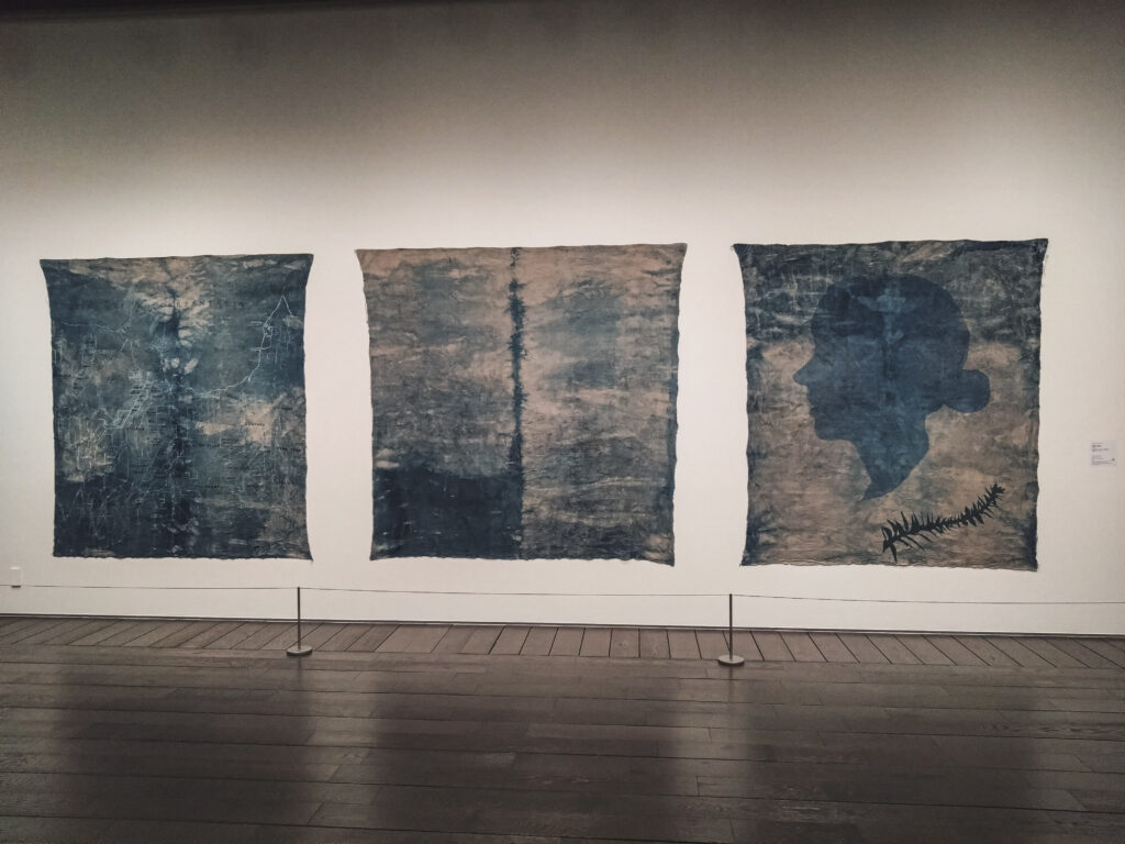 そして、別の壁には、藍染のような青い布に描かれた三つの作品が並んでいました。