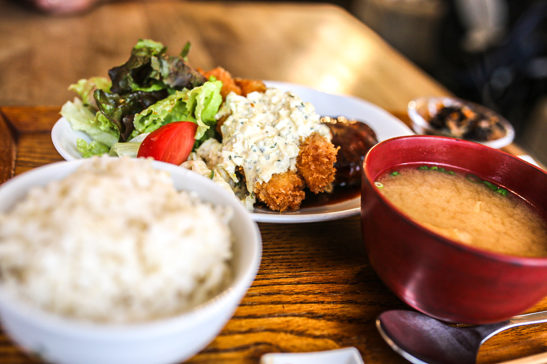 ハンバーグはケチャップとソースを合わせた懐かしの味わいで美味しかった。エビフライも手作りのタルタルソースと合わせて、リッチな味わい。